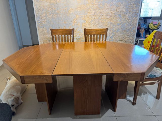 שולחן משושה באורך 120 סמ עם 4 פתיחות שנפתח ל 3 מטר. שולחן מושלם במצב סגור ל 6 אנשים . שולחן מיוחד, שמור מאוד, פרקטי עם יכולת פתיחה להרבה אורחים.פרטים נוספים