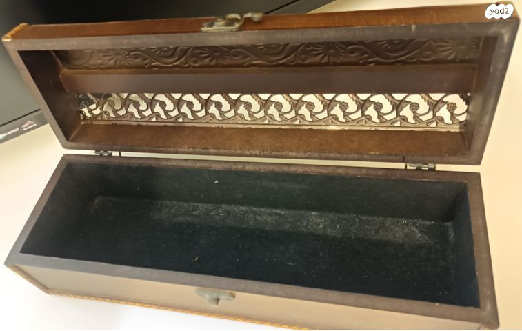 מארז יין. תיבת עץ מעוטרת. ריפוד קטיפה ונעילה. מתאים לבר, הגשה, מתנה או אחסון פריטים אחרים...פרטים נוספים